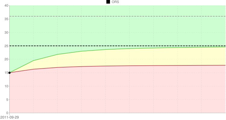 An example of the type of feedback provided by the new algorithms is found below. The graph displays three zones of potential progress (or ETR’s) for a client scoring 15 on the ORS at intake. Scores falling in the “green” area from session to session are similar to treatments that ended successfully. As might be expected, those in the “red” zone, ended unsuccessfully. Finally, scores in the “yellow” zone had mixed results. In each instance, both the client and therapist are provided with instant feedback: green = on track, red = off track, yellow = concern.